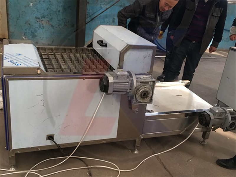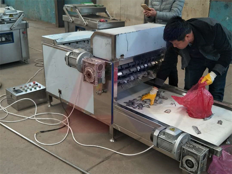 諸城市科力機械研制的全自動系列切魚機,又叫帶魚段機、刀魚段機。有切凍魚機、切鮮魚機、有橡膠輸送帶切魚機、有不銹鋼輸送帶切魚機。用戶可以按照所切魚的長度選擇切魚機型號。所切魚段的長度是可調的。由下面輸送帶傳送,上傳送帶壓住后送往圓刀下高速切割,切面平整無碎屑,效率高,每小時可切1噸。輸送帶速度可調。