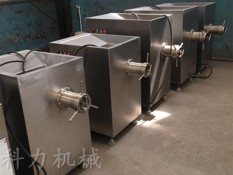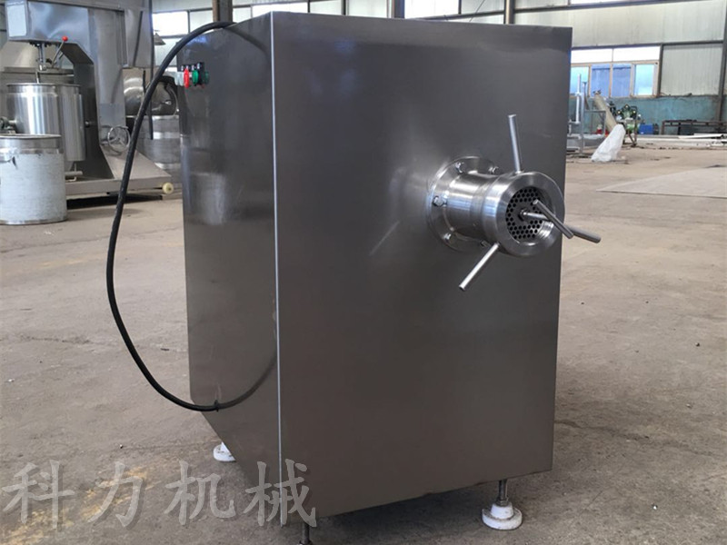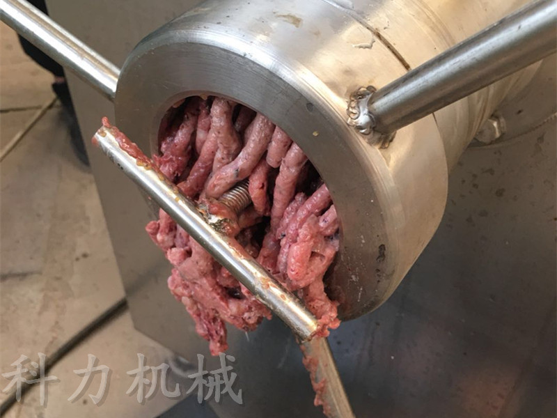凍肉絞肉機(jī)是肉制品生產(chǎn)行業(yè)中通用性高、使用范圍廣的一種肉食加工設(shè)備。它是依靠螺桿將料斗箱中的原料肉推到預(yù)切板處,通過螺桿的旋轉(zhuǎn)擠壓使孔板與絞刀產(chǎn)生相對質(zhì)運(yùn)轉(zhuǎn),從而將原料肉切成顆粒形狀,確保了肉餡的均勻性。通過孔板的不同組合可達(dá)到理想的要求的不同肉餡。